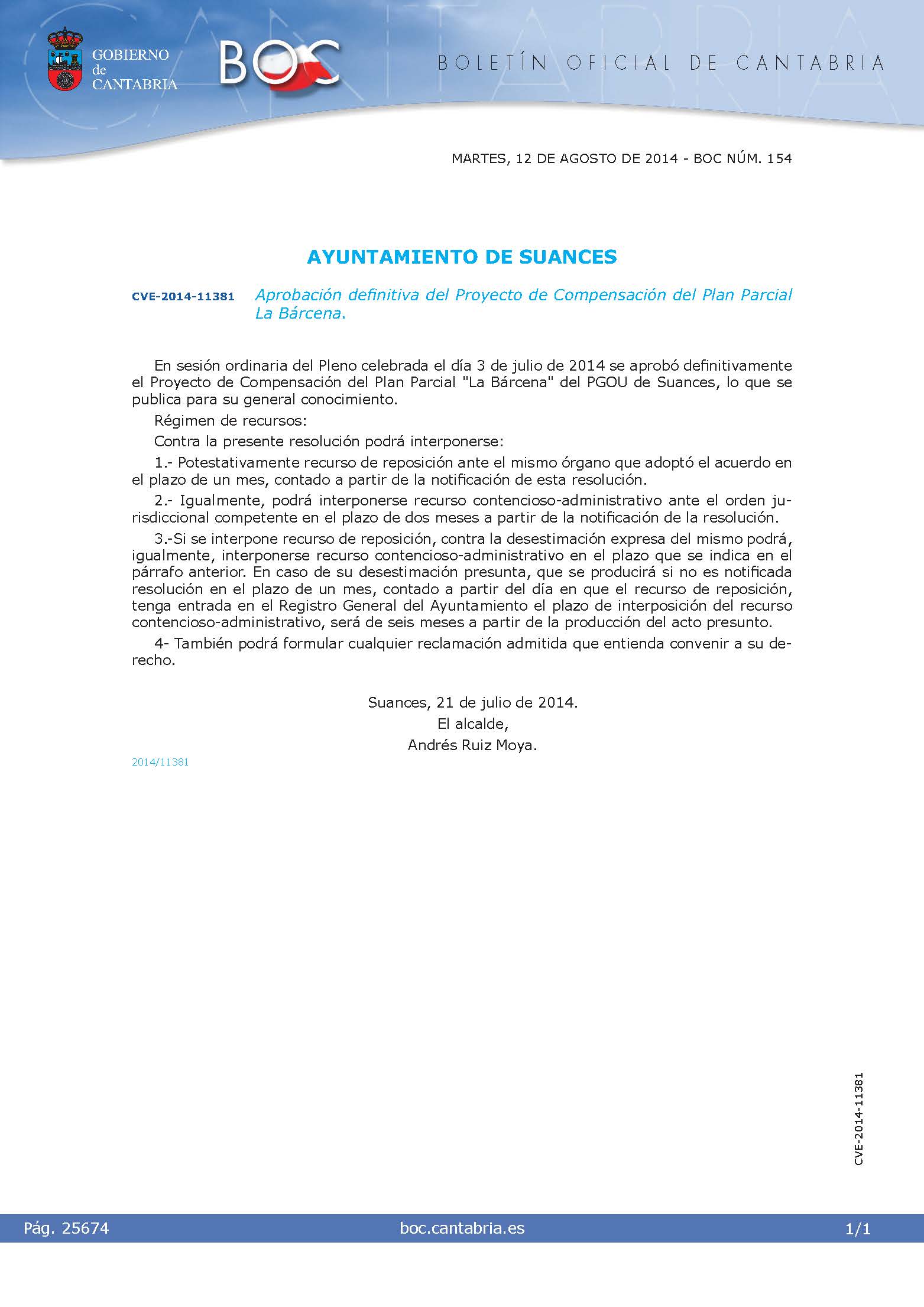El ayuntamiento de Suances aprueba el proyecto de compensación del Plan Parcial "La Barcena" en Suances. Delfín Cruz S.A. es el único propietario. |
